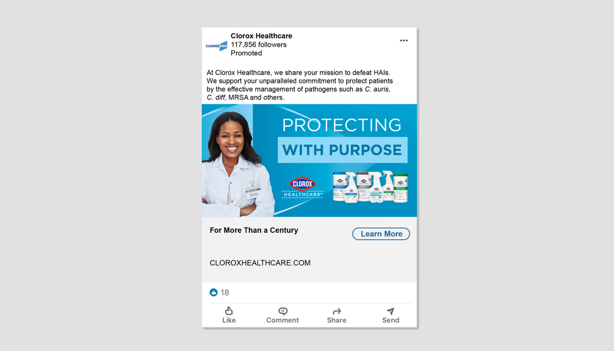 Maricich Health conducted a thorough discovery and analysis, including competitive reviews and stakeholder research, to develop a unique brand position and captivating message of “Protecting with Purpose.” This creative refresh not only redefined Clorox Healthcare’s position in the disinfection market but also showcased its commitment to safeguarding public health. By deploying an array of print and digital advertisements, the campaign reached its targeted audience effectively. Complemented by strategic social media content, it significantly elevated Clorox Healthcare’s visibility and differentiated its value proposition. The initiative not only reinforced Clorox Healthcare’s leadership in the industry but also marked a pivotal shift in how it communicates its core message of infection control and protection, ensuring its prominence in a highly competitive landscape.